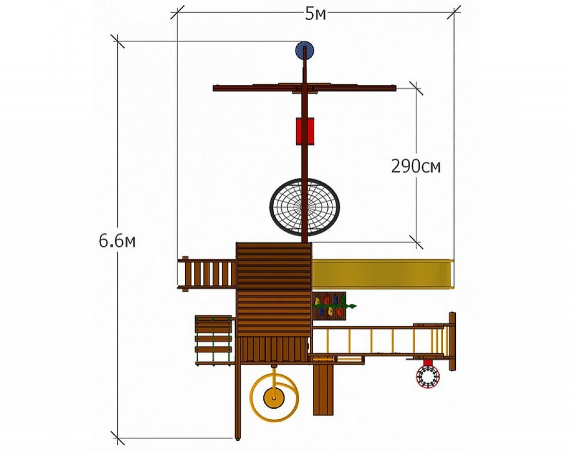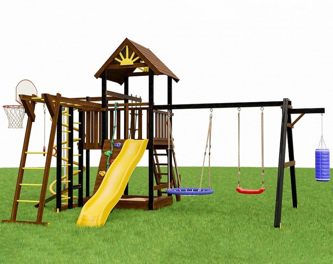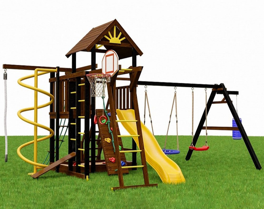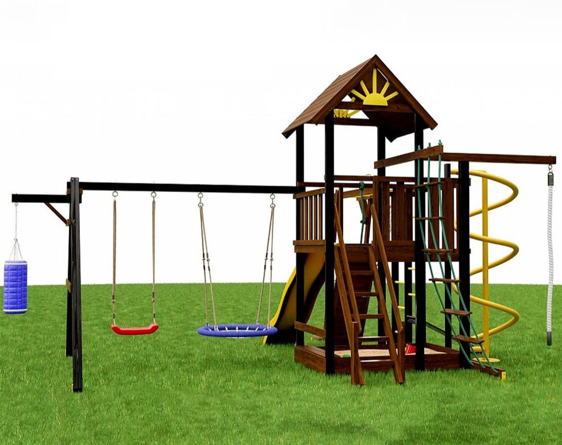 Качели, горка, спортивные снаряды и мтеллическая спираль— всё создано для активных и любознательных детей. Прочная конструкция из массива сосны прослужит долго, а благодаря обработке не боится капризов погоды.