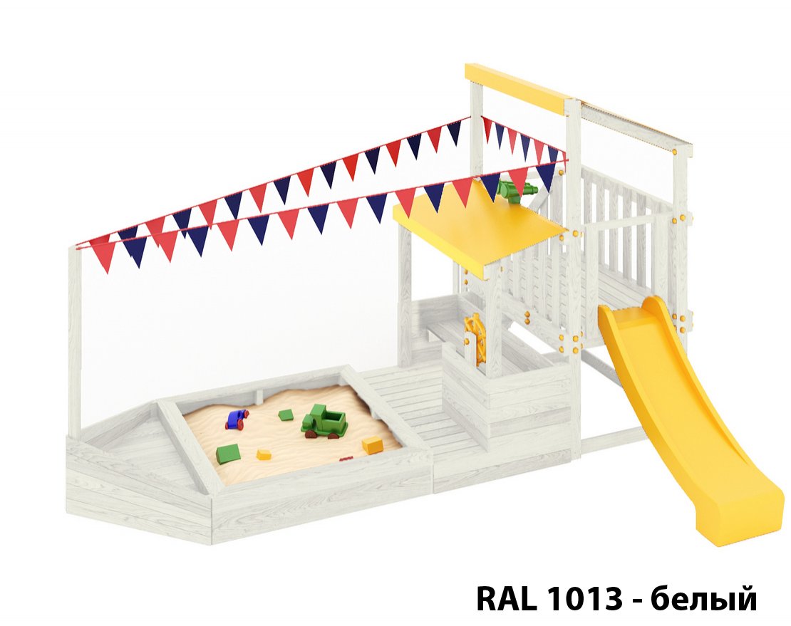 Детская песочница-кораблик, включающая в себя штурманскую рубку и капитанский мостик с горкой с высоты 900 мм с флажками, а также две крыши закрытые тентом, чтобы можно было отправиться в дальнее плавание даже под дождем.