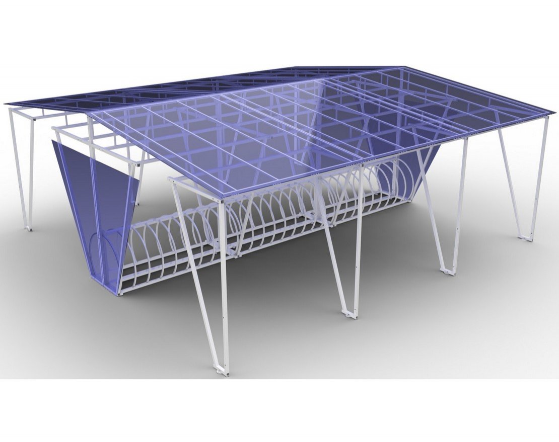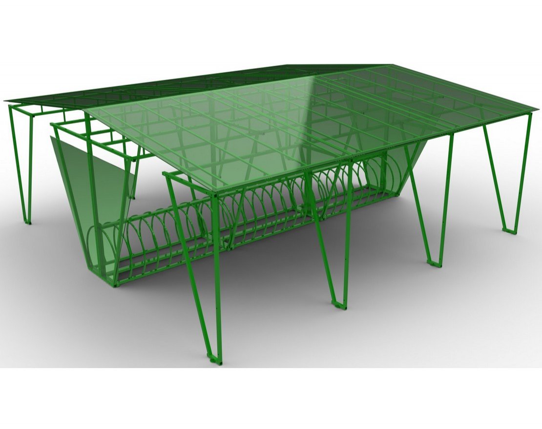 Велопарковка с навесом "Шаттл" устанавливается в парках, зонах отдыха, у торговых центров и других городских локаций. Обеспечивает упорядоченное размещение как велотранспорта, так и самокатов, защищая от осадков и ультрафиолета.