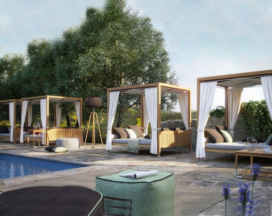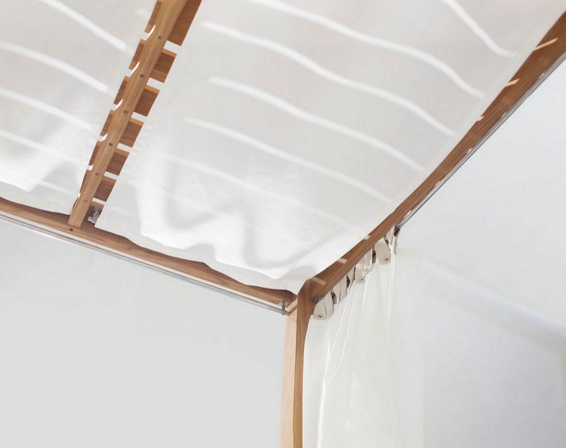 Полная комплектация: теневые занавесы из хлопка, 7 шт. подушек и 2 матраса.