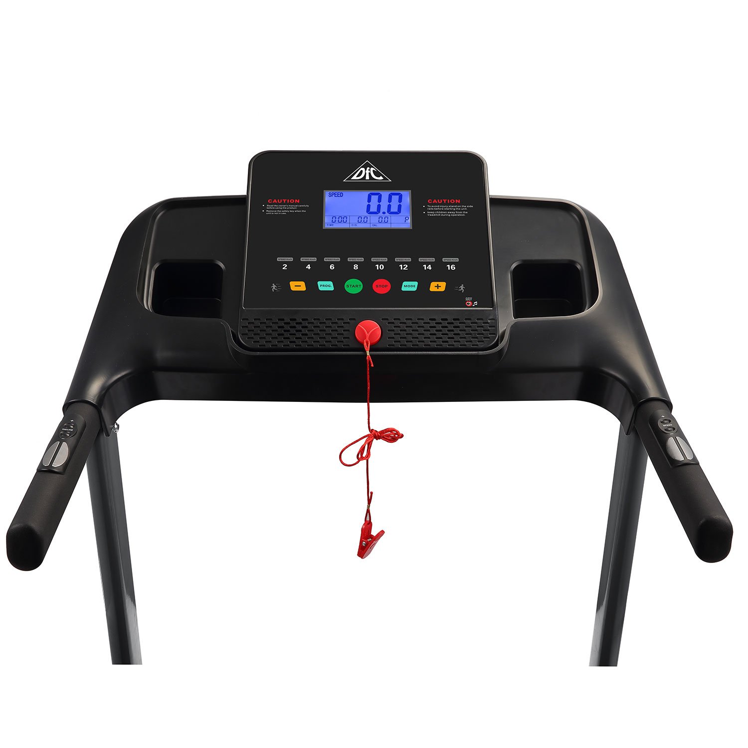 На поручнях так же расположены "быстрые кнопки" - это кнопки запуска и остановки бегового полотна, а так же кнопки изменения скорости. Это позволяет не отрывать руки с поручней во время занятий не тренажере.